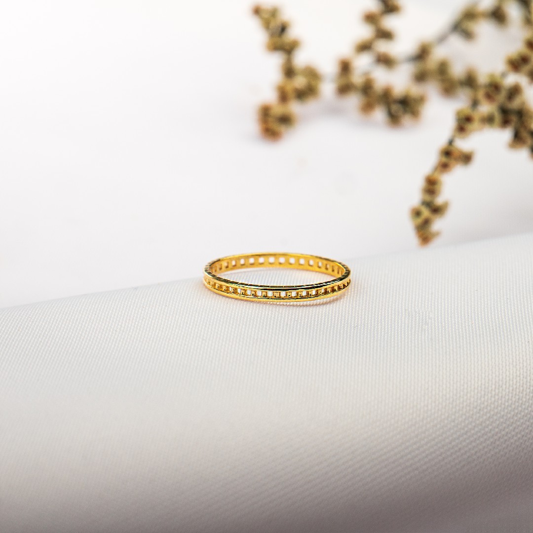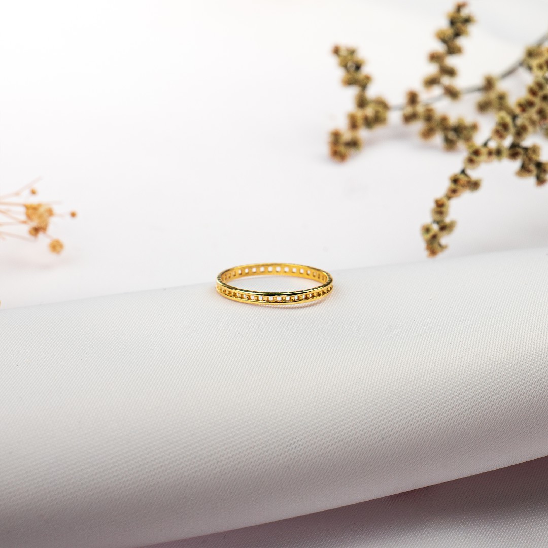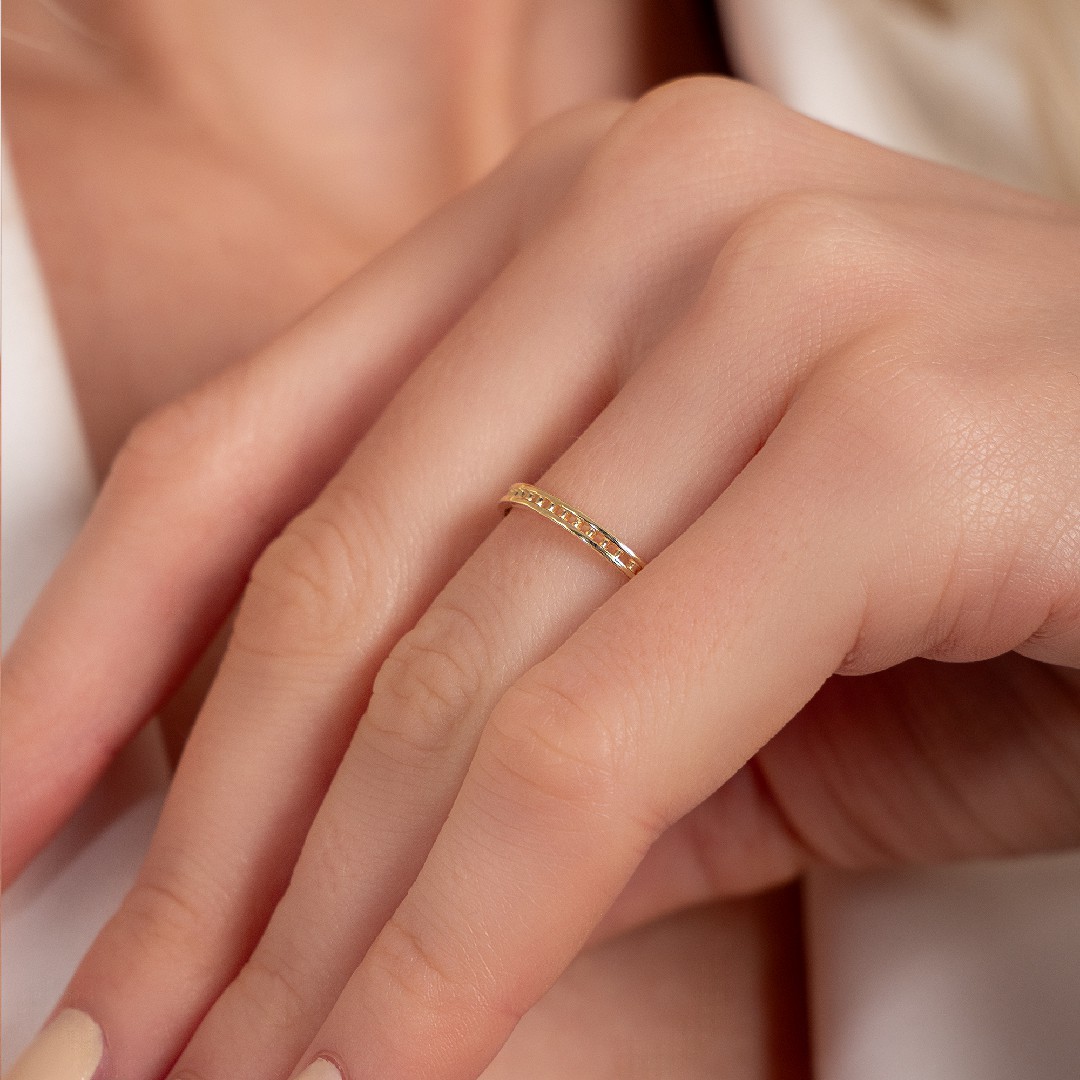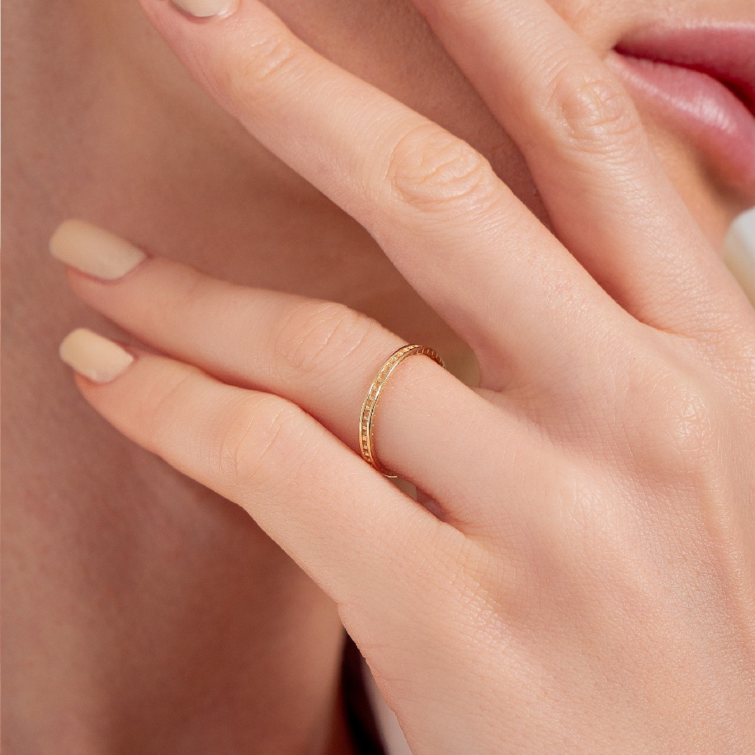 Our sleek, stackable ring features a subtle width of 2.10mm and a comfortable thickness of 1.1mm. Designed for versatility, it can be worn alone for a simplistic look or paired with other rings to create a layered statement.